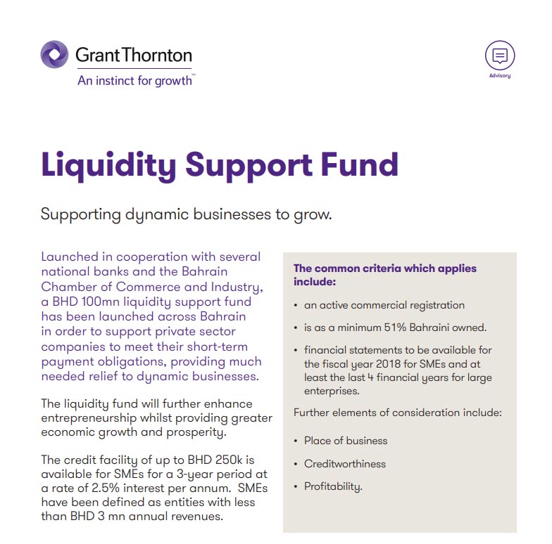 The application for SMEs to apply for liquidity support funding is now open and available until 19 March 2020. Our transaction advisory team can support eligible entities with the review of their formal application, required documentation and can support you through the process. For further details, contact our team to unlock your growth potential in Bahrain.